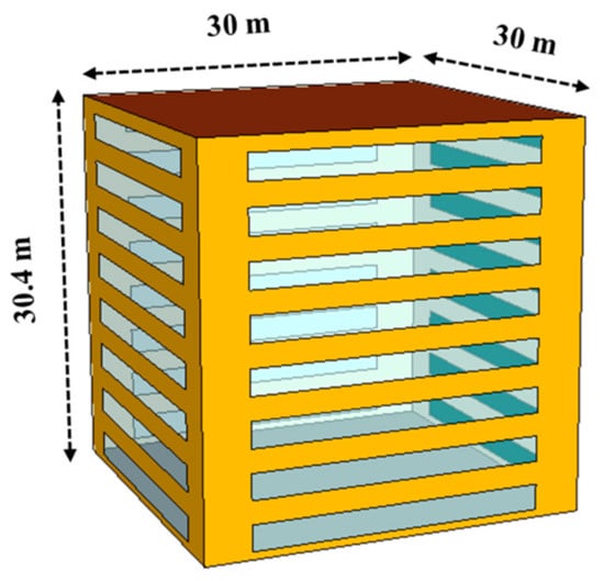 The target building was assumed as a typical office building of eight stories. The floor area of each floor was 900 square meters, and the total floor area of the building was 7200 square meters [20]. Figure 4 shows the image of three-dimension modeling.
