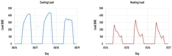 The heating and cooling loads of the target building were analyzed using the dynamic analysis simulation software TRNSYS. Measurements were performed every hour in the simulation, and the cooling/heating load for one year was simulated. Figure 5 shows the cooling and heating operation patterns of the office building. During the cooling operation, the day with the highest load was August 17, and the maximum load was measured to be approximately 437.5 kW. During the heating operation, the day with the highest load was January 15, and the maximum load was measured to be approximately 336.2 kW. The maximum load of cooling was found to be higher than that of heating. Thus, the maximum load of cooling was used for the design of the GSHP system.
