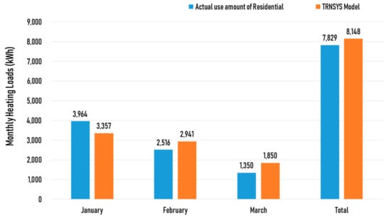 In order to verify the simulation model in this study, the calculation results of the heating load were compared with real measurement data. Figure 6 shows the comparison result between the calculation results in the same condition as the real building and the measurement data of the real building during the heating season. There were a few errors, but the safety factor of total value was within 4% and below 20%, which is the ASHRAE standard of prediction simulation [24].