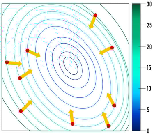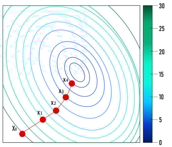 This optimization algorithm used gradient descent optimization, and was one of the basic function optimization methods, applying the concept of differentiation to optimization. It minimized the value of the objective function using the characteristics of the gradient. The algorithm found the x value that minimized the value of , while moving in the opposite direction of the gradient from the initial value of , as shown in Equation (1). Figure 8 summarizes this algorithm.