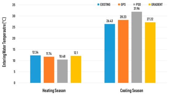Figure 11 shows the average EWT values of the heat pump during cooling/heating for the existing design and optimization designs. For the existing design and all of the optimization algorithms that were used, the aforementioned constraints for the EWT during cooling/heating were met. For the existing design, the average EWT of the heat pump was 26.43 °C for cooling and 12.34 °C for heating. For the discrete Armijo gradient algorithm (gradient), the average EWT increased by 3% for cooling and reduced by 2% for heating compared to the existing design. For the particle swarm optimization (PSO), the average EWT increased by 21% for cooling and reduced by 15% for heating. For the coordinate search method (GPS), the average EWT increased by 7% for cooling and reduced by 5% for heating. The largest variation of the average EWT was observed for the cooling/heating of the PSO algorithm. This appeared to be because the largest reduction was seen in the capacity due to optimization.
