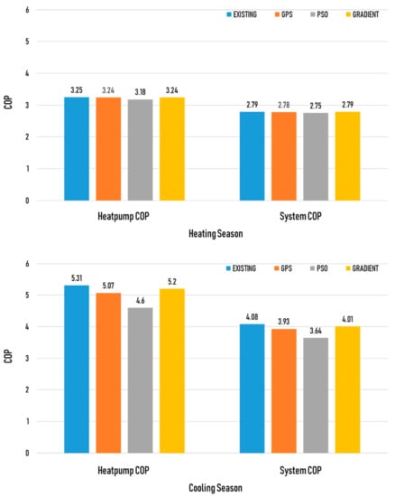 Figure 12 shows the average heat pump COP and average system COP results for the existing design and the optimization algorithms used. For the existing design, the average heat pump COP and average system COP were found to be 3.25 and 2.79 for heating and 5.31 and 4.08 for cooling, respectively. The PSO algorithm exhibited the lowest average heat pump COP and average system COP for both cooling and heating, while the discrete Armijo gradient algorithm showed the highest values. This was because optimization was performed in this study with a focus on cost; thus, the system performance was minimized. It appeared that the discrete Armijo gradient algorithm exhibited the highest average COP values because it reached local optimization relatively fast while performing optimization.