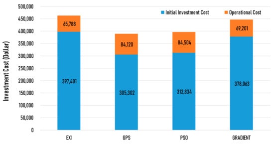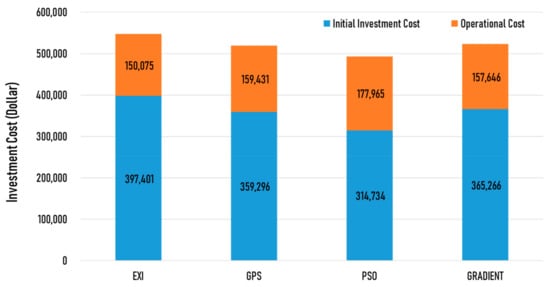 Figure 14 shows the result of life-cycle cost for 20 years, including the initial investment cost and the annual operation cost. The optimization results showed that the investment cost was reduced for all the algorithms compared to the existing design method.