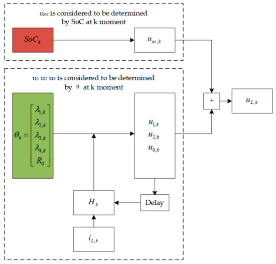 The structure of this Equation can be further illustrated by Figure 3. At k-moment, model output voltage uL,k is determined by state SoCk and model parameter θk. The former decides uoc,k according to the function uoc(SoC), and the latter decides u1,k, u2,k, u0,k together with data matrix Hk. This means that state and model parameters determine different output regions respectively in the process of equation iteration. The advantage of this method is that it can eliminate the strong correlation between state and model parameters, and lay the foundation for using dual filters.