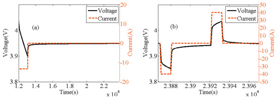 (a) The experimental curve of voltage and current of 1/3C discharge and 3 h rest in a cycle under Hybrid Pulse Power Characterization (HPPC) test. (b) The experimental curve of voltage and current of 1C pulse discharge and charge in a cycle under HPPC test.