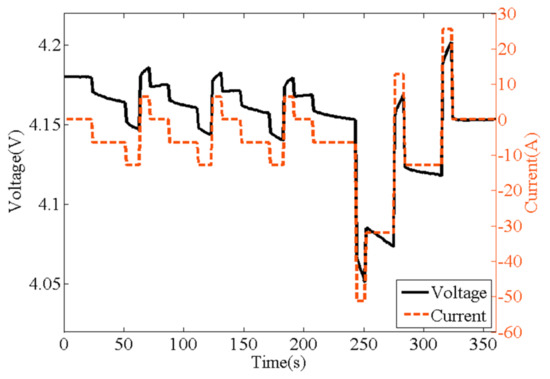 In order to further verify the performance of the proposed algorithm, the Dynamic Stress Test (DST) was carried out, refer to [26]. The DST is to simulate the dynamic power of driving electric vehicle by loading preset current, so as to test the dynamic performance of the battery. The experimental curves of current and voltage in one cycle are shown in Figure 7.