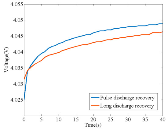 The comparison of recovery voltage curve between pulse discharge and long discharge when SoC = 0.902 (first 40 s).