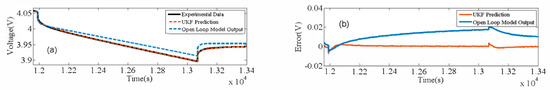 (a) The voltage comparison between experimental data, UKF prediction and open loop model output when SoC drops from 0.902 to 0.834. (b) The error comparison between UKF prediction and open loop model output when SoC drops from 0.902 to 0.834.