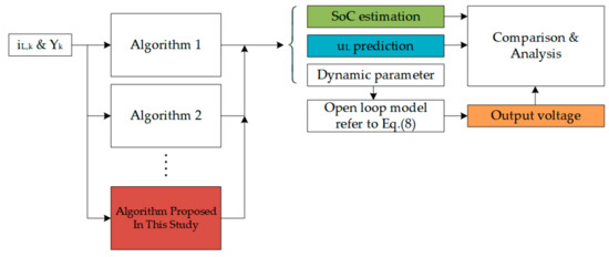 The structure of the algorithm comparison experiment in this section is shown in Figure 11. For each algorithm, the experimental current iL,k and voltage Yk are loaded, the SoC estimation curves and the algorithm predicted voltage curves are drawn. The dynamic parameters modified by the algorithms are input into the open-loop model in Equation (8), and the output voltage curves are drawn.
