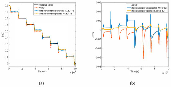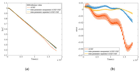 It is worth discussing that the model parameters obtained from the off-line identification are input into the open-loop battery model in Equation (8) and a common UKF for SoC estimation based on this model. The predicted voltage results are quite different. Taking the SoC drops from 0.902 to 0.834 in HPPC test as an example, the RC parameters are taken as the values when SoC = 0.902. Figure 10a is the curve comparison of the output voltage of the open-loop model, the predicted voltage of the UKF and the experimental data; Figure 10b is the error comparison. It can be seen that the predicted voltage error of UKF is significantly smaller than that of open-loop model even though the parameters adopted are identical. One of the characteristics of Kalman filter is that it can modify the state according to the observation (in this case, the experimental voltage data) to get its maximum likelihood estimation. This determines that the algorithm can gradually correct the initial value of the state when it is inaccurate, which also means the prediction can always converge to the observation [23]. However, in the case of inaccurate model, the negative impact of this feature is that the filter may over correct the state and reduce its estimation accuracy, which will be verified in 5.3. Therefore, the error between the voltage prediction of closed-loop algorithm and the experimental data cannot reflect the actual model accuracy, on the contrary, it may confuse the judgement. In this study, the modified parameters of all the algorithms in 5.3 will be input into the open-loop battery model, and the effects of model accuracy on SoC estimation are compared.