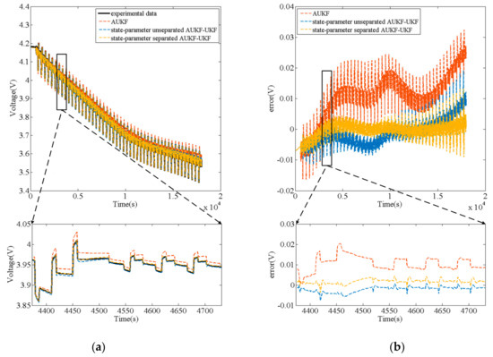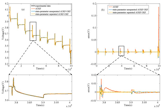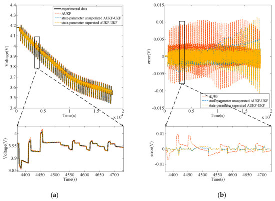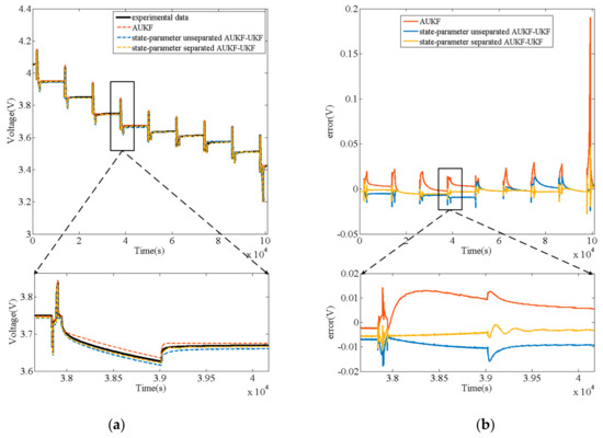 Figure 12a is the SoC estimation result of three algorithms under HPPC test, and Figure 12b is the SoC estimation error of three algorithms. The black curve represents the reference SoC based on the experimental measurement of its initial value and ampere-time counting method combined with the current data; the red curve, the blue curve and the yellow curve represent AUKF, state-parameter unseparated AUKF-UKF, and state-parameter separated AUKF-UKF respectively. Similarly, Figure 13 shows the uL prediction results of three algorithms under HPPC test and their errors between experimental voltage data. The output voltage shown in Figure 14a is obtained by inputting the parameters which are modified by the three algorithms (AUKF’s parameters are constant) into the open-loop model. Figure 14b shows their errors between experimental voltage data. errormax (maximum error) and root mean square error (RMSE) are set to analyze the error data in this study. The calculation formula is shown in Equation (25).
