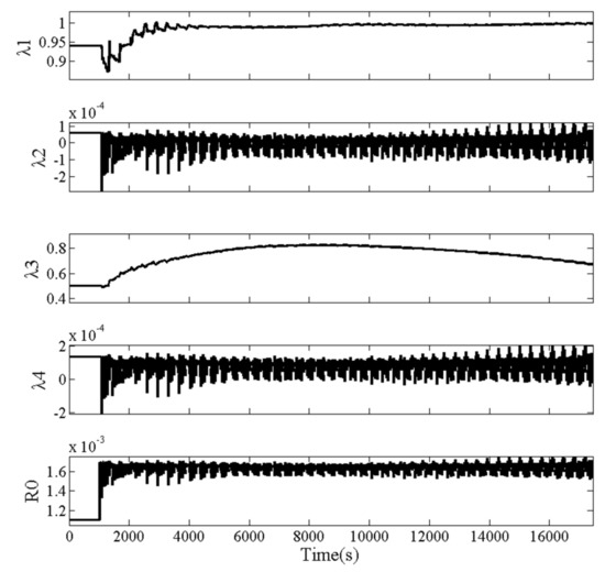 Figure 18 shows the SoC estimation and uL prediction curve of IAUKF-UKF algorithm under different initial SoC. It can be seen that the algorithm can converge to the real value when the initial SoC is inaccurate. It can also be found that the convergence time increases with the increase of initial error from Table 6. Figure 19 shows model parameter modification curves when the initial SoC is set to 0.7. It can be found that the parameters are not modified before 1023 s and remain constant. After 1023 s, the SoC and uL prediction have converged to the real value and the parameter modifier is turned on. Figure 20 shows the SoC estimation and uL prediction curve of the traditional AUKF-UKF under different initial SoC. It can be seen that when the initial SoC is inaccurate, the uL prediction of the AUKF-UKF can still converge to the experimental data, but the SoC estimation has not converged to the reference, which means invalid. This shows that it is unreliable to use the convergence performance of uL prediction to judge that of SoC. In summary, the IAUKF-UKF algorithm proposed in this study can overcome the shortcomings of the traditional DUKF in the case of inaccurate initial state, and enhance the robustness of the algorithm.