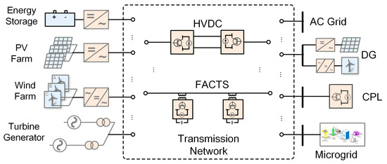 In modern power systems, more and more renewable energies such as solar and wind energy are integrated with the power grid through grid-connected power converters. To use this energy in more efficient ways, several advanced techniques, such as high voltage direct current transmission (HVDC) [1], flexible AC transmission systems (FACTS) [2] and energy storage systems (ESSs) [3], are developed. Some power electronic converter-based applications on the customer side, such as constant power load (CPL) and micro-grids with ESSs, are also widely used for some purposes, like peak load shaving. All the above yields a more complicated power system with a large amount of power converters. A typical power system integrating high penetrated renewable energy sources is depicted in Figure 1. The irregular phenomenon and uncertainty of wind and solar energy may cause undesired grid conditions [4]. Sub- and super-synchronous oscillations may emerge in wind farms if the controller is not well-designed [5]. In recent years, these issues happened several times in Oklahoma, USA [6] and Hebei and Xinjiang, China [7,8], and caused many wind turbines to be tripped off. This highly impacted the operation of power distribution and renewable energy utilization. The grid frequency is prone to deviate from its nominal value since the inertia of the grid decreases. Grid voltages contain an amount of undesired components, such as fundamental frequency negative sequences (FFNSs) and harmonic components, which results in unbalanced and distorted grid conditions. It is an essential requirement for a renewable energy power converter to maintain stable operation with high performance under such conditions. To achieve this goal, a proper grid synchronization method is needed for all grid-connected applications. It is a big challenge for a grid synchronization method to extract grid frequency and phase information under such adverse conditions.