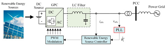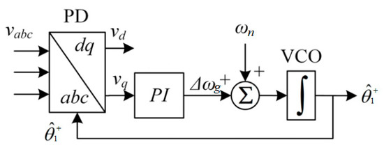 Among various grid synchronization techniques, phase-locked loop (PLL) is the most widely used method in grid phase and frequency detection area for its robust performance and simple implementation [9,10,11,12]. Figure 2 shows the most common employment of PLLs in practical applications. After extracting grid voltage information at the common coupling point (PCC), PLL sends estimated grid phases to the controller of the grid power converter (GPC). For a three phase power system, synchronous reference frame PLL (SRF-PLL) is an effective and typical method under ideal conditions [13,14]. However, with more utilization of renewable energy sources, a power system turns “weak” [15,16,17,18]. The grid voltages usually contain fundamental frequency negative sequence components (FFNSs) and other harmonic components. Furthermore, grid frequency does not always stay at its nominal value. To maintain the phase tracking accuracy under distorted grid voltages conditions, various filtering technique were used to remove disturbances at the cost of slowing down the transient response, which may violate the requirement on settling time in common grid codes [19,20,21,22,23].