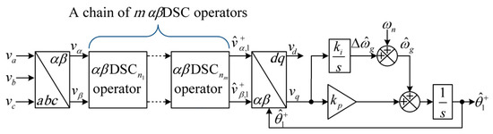 To achieve a desired performance, several DSCs have to be connected in cascaded. For instance, five DSCs with different value of n (n = 2, 4, 8, 16, 32) were arranged at the pre-filtering stage in [37]. The typical block diagram of the control strategy is shown in Figure 4. Too many DSCs used in PLLs results in complicated implementation. It is a normal idea to simplify the system by reducing the number of DSCs.