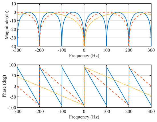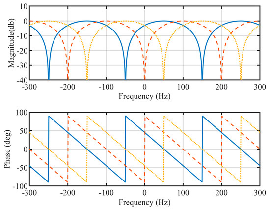 To examine the effect of two parameters (m, n), two bode diagrams are depicted in Figure 6 and Figure 7. In Figure 6, n is set to 4. The solid lines, dashed lines and dotted lines correspond to different MDSCm,n=4 with m = 4, 2, 4/3, respectively. The frequency characteristic of MDSCm=4,n=4 can be considered as that of MDSCm=1,n=4 shifted = 50 Hz along the positive frequency direction. MDSCm=2,n=4, MDSCm=4/3,n=4 corresponds to = 100 Hz and = 150 Hz, respectively. This nice property can be used to arrange the notch frequency of MDSCs by setting an appropriate m.