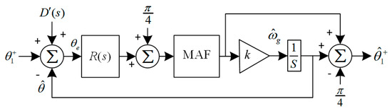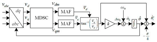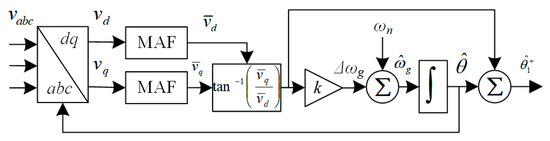 The block diagram of SRF-PLL is depicted in Figure 3. Park transformation is utilized as a phase detector (PD). An integrator is employed as a voltage controller oscillator (VCO). A proportional-integral controller (PI) is used to mitigate the phase-tracking error. To enhance the disturbance rejection capability and keep the phase tracking accuracy of SRF-PLL, a low pass filter (LPF) or moving average filter (MAF) is employed in the inner loop. However, LPF-based PLL can only attenuate but not eliminate the disturbance component. To achieve good disturbance rejection, the bandwidth of LPF-based PLL must be significantly reduced, which results in a large settling time [23]. Compared with LPF, MAF can totally remove a specific set of disturbances, which depends on its window length (Tω). However, Tω deteriorates the dynamic response since Tω has to be 0.01 s (half grid period) to eliminate all disturbance [24].