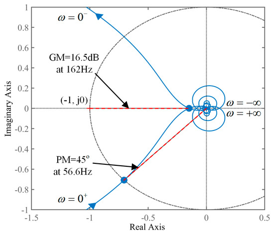 Since the model of the proposed PLL contains a time delay unit, the system turns out to be a non-minimum phase system. To examine the stability, nyquist stabilization criterion is employed in this paper instead of using a bode diagram. The nyquist diagram of Gols(s) is depicted in Figure 15. The nyquist curve does not surround the (−1, j0) point, which means the closed-loop feedback system of Gols(s) is stable. The gain stability margin (GM) is 16.5 dB at 162 Hz. The phase stability margin (PM) is 45° at 56.6 Hz.