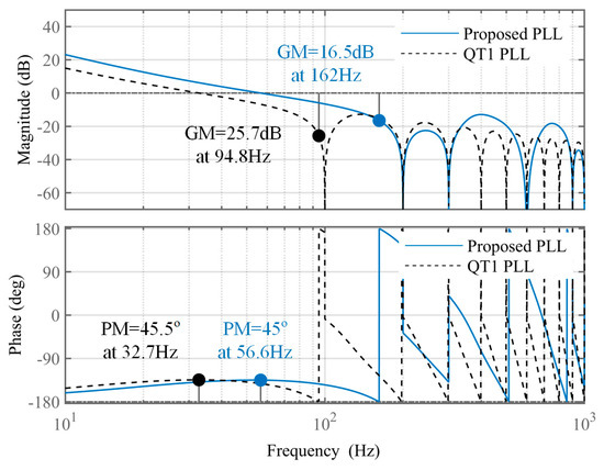 The bode diagram of the proposed PLL and QT1-PLL is depicted in Figure 16. It can be seen that the crossover frequency of the proposed PLL is larger than that in the QT1-PLL. This yields faster transient behavior for the proposed method. It is noted that the 100 Hz component is only attenuated in the bode diagram. This does not reveal the filtering capability at 100 Hz, since the diagram is based on the model whose input is grid phase, not grid voltages. The filtering performance is already analyzed in Section 3. Experiments are also carried out to verify the filtering capability in the next section.