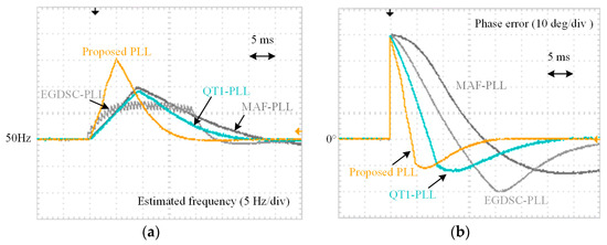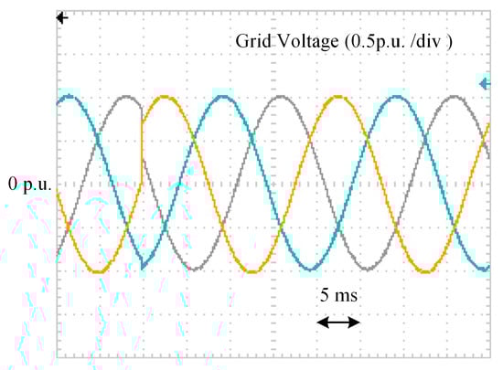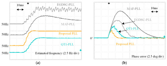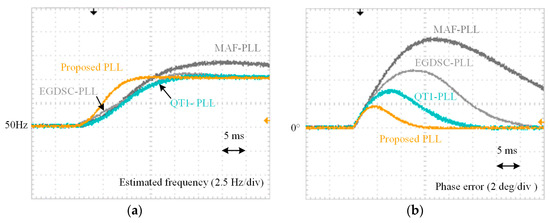 The performance is evaluated when phase jump occurs in grid voltages. Figure 19 shows the waveform of three phase voltages. A +40° phase jump came up during the experiments. Figure 20 shows the transient behavior after a phase jump. It is observed that the proposed PLL provides the fastest transient response. The settling times of phase-error and estimated frequency are around one grid period. The dynamic behavior of QT1-PLL takes over 30 ms to converge. The dynamic performance of EGDSC-PLL and MAF-PLL are even more unacceptable, owing to their more than two grid period settling time. According to the requirement of a transient response in some grid codes [21,22], an accurate estimation of grid voltage information should be extracted after undesired injection of disturbance within 25 ms. EGDSC-PLL and MAF-PLL can definitely not fulfill this requirement.