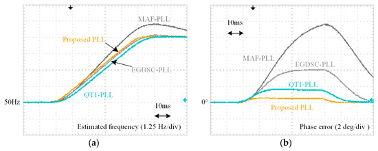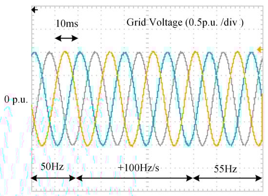 In practical conditions, grid frequency can hardly have a step change. Most of time, grid frequency varies bit by bit continuously. Consequently, a ramp change is implemented to the grid frequency to examine PLLs’ performance. The grid frequency rises from 50 Hz to 55 Hz with a +100 Hz/s ramp rising rate. The whole behavior last for 50 ms. Figure 23 shows the waveform of grid voltages during this rising procedure. Figure 24 shows the transient behavior of four advanced PLLs. It can be seen that the proposed PLL provides 0.5° phase error during the frequency rising procedure. The phase error of QT1-PLL is less than 2°, which is also acceptable. By contrast, the phase errors of EGDSC-PLL and MAF-PLL are too big, which means PLL cannot provide acceptable phase information during the frequency changing procedure.