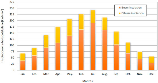 Ib,t data were provided by Meteonorm software (7.1 version) [38], that offers a unique combination of reliable data sources and sophisticated calculation tools. It provides access to typical years and historical time series. Figure 2 shows the values of the beam, diffuse and global insolation (sum of the first two) on a horizontal plane (kWh·m−2), obtained throughout a year for the location showed in Table 3.