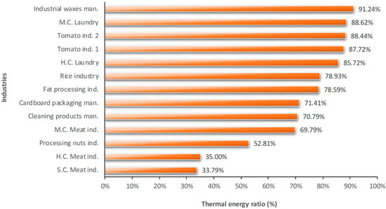 Figure 3 shows the classification obtained according to the thermal energy ratio criterion. The industry that showed the highest percentage was the industrial waxes manufacturer, because it uses a considerable amount of steam to avoid the solidification of wax during the production process (passing through pipes, etc.). The following industries are the industrial laundries and tomato industries. The former showed high thermal energy demands during washing, drying and ironing. The latter, spent thermal energy in processes such as pre-heating, evaporation and sterilization.