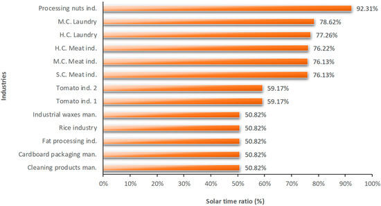 This way, it is possible to determine the fraction of time in which the working schedule overlaps with the solar schedule. This fraction of time is called solar ratio, RST, and it was obtained through Equation (2), where SPj and TPj (hours) are the production times in the solar schedule for each month j, and n is the number of months of operation for the industry. On this basis, the industries whose working schedule overlaps with the solar schedule to a larger extent will benefit from this technology to a greater extent,