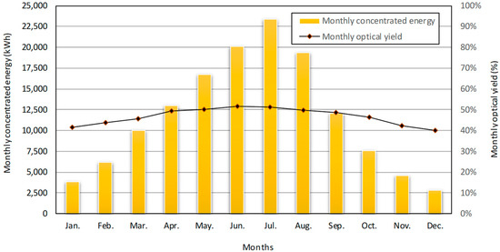 As an example of the simulation studies carried out, Figure 5 shows the results obtained for one of the industries visited, namely, the medium capacity laundry. It could be observed how the monthly concentrated energy considerably increased during the months with the highest isolation (23,363 kWh in July, whereas, December showed 2782 kWh, that is, 8.4 times greater compared to the latter). Instead, the monthly optical yields were kept between 40 and 52% in the year. These data were within the range obtained by other authors. Thus, Kincaid et al. [39] found that the yearly optical efficiency, according to their models, was 40%. Mohamed H. Ahmed et al. [40] simulated the optical performance of a linear Fresnel obtaining 67% with their optical model and 38.8% accounting the sun-to-electric annual average efficiency. According to Ghodbane et al. [41], the optical efficiency of the solar reflector in their simulation reaches 53.7%.