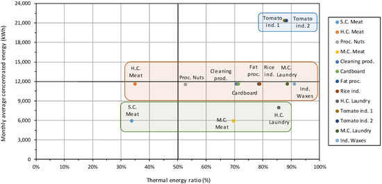 Therefore, and due to the fact that solar time ratio was directly incorporated to the energy simulations carried out, Figure 6 relates the criteria used—thermal energy ratio vs monthly average concentrated energy—and graphically shows the susceptibility level for the different industries for the implementation of LFC technology.