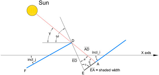 Thus, two new cases, when the angle of inclination of the shaded mirror, incl_i, is negative, were defined. In turn, Figure 8 represents the case when the row of mirrors that casts shadows has a negative inclination angle, calculating the shadow cast from the position of point D. On the other hand, Figure 9 represents the complementary case, in which the row of mirrors that casts shadows have a positive inclination angle, calculating the shadow cast from the position of the other edge of the row, that is, point F.