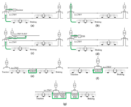 Regenerative braking energy (RBE) utilization schemes (a) regenerative resistance; (b) feeding into grid; (c) feeding into distribution grid; (d) storage energy with an energy storage system (ESS); (e) tie feeding in a section post (SP); (f) tie feeding in a traction substation (TS); and (g) smart electrical infrastructure.