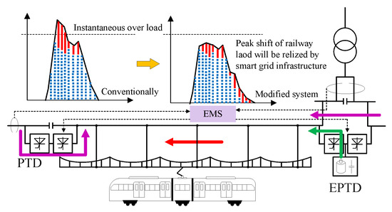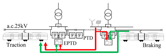 However, as shown in Figure 1e,f, if there are no traction locomotives in the adjacent feeding section, the regenerative power flows back into the utility grid. The schemes in Figure 1g can solve this problem to a certain degree by transferring the surplus regenerative power to the traction locomotives in the other nonadjacent electrical sections. However, if the amount of regenerative power is more than the traction power in the whole railway system, the surplus regenerative power flows back into the utility grid. Therefore, to solve these problems, the installation of PTD with the ESS (EPTD) is a feasible option [34,35,36,37,38]. Via EPTD, it is possible to interchange RBE with the adjacent feeding sections when there are traction locomotives present and store the RBE when there is a surplus. Figure 2 shows the proposed energy-storage-based smart electrical infrastructure for AC-fed railways with NZs. The proposed modified system links the whole railway power supply system together by PTDs and EPTDs, allowing power flow, energy storage, and release within the internal railway system. Moreover, the modified system can not only use RBE, but also can also use clean energies and control their cooperation. Other than these, the proposed modified system also has other functions as follows: