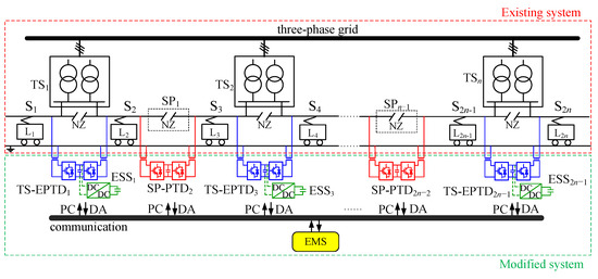 The railway traction system with energy-storage-based smart electrical infrastructure is shown in Figure 3. The red dashed line is the existing infrastructure in AC-fed railways with NZs. For the sake of analysis, all locomotives on the same power supply section are equivalent to one electrical locomotive load. The existing system consists of n TSs, where TSm (m = 1, 2, …, n) is used to supply trains Lk (k = 1, 2, …, 2n) in the power supply sections Sk. The NZ is used to ensure electrical insulation between two adjacent power supply sections. The green dashed line is the proposed energy-storage-based smart electrical infrastructure. The modified system consists of the additional PTDs and EPTDs connected in parallel to both sides of each NZ and an energy management system (EMS). The acronym TS-EPTD refers to the PTDs with the ESS located in the NZs of the TSs. The acronym SP-PTD refers to the PTDs located in the other NZs of the SPs. The installation of TS-EPTDs will connect all power supply sections to ESSs, so there is no need to install EESs in SP-PTDs. The active and reactive power transferred by PTDs and EPTDs is specified by the EMS via the bidirectional communication equipment. The modified system can perform a centralized and a distributed-control. The centralized architecture can perform a global optimization to achieve the cooperative operations between each component, significantly enhancing the energy-management performance of the systems. The distributed control can further enhance redundancy and reliability of the railway systems [31,33]. Each EPTD and PTD can realize data acquisition (DA) of voltage and current on each power supply section and transmit the data to the EMS via the bidirectional communication equipment. The EMS performs a global optimization by the use of the data of voltage and current and has power control (PC) over the EPTDs and PTDs via the bidirectional communication equipment. It should be pointed out that the proposed system is also applicable for autotransformer (AT)-based railway systems.