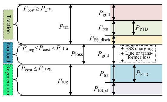 The energy distribution of the whole railway system is shown in Figure 5. P_tra is the judgment threshold of the traction condition; P_reg is the judgment threshold of the regeneration condition; Pgrid is the power supplied by the utility grid; PPTD is the transferring power by EPTD and PTD; PES_disch is the discharge power of EES; PES_ch is the charge power of EES. P_tra and P_reg can divide power allocation into three states: traction, non-load, and regeneration. In the traction condition, the traction power is supplied together by the grid, the regenerative power and the stored regenerative power in EES. In the non-load condition, there are no trains running or in the cruising state. However in practice, there will be losses in transformers, lines, etc. At this time, the line loss, transformer loss and other losses are powered by the grid. Furthermore, the ESS can be charged for other functions in this condition. In the regeneration condition, the regenerative power supplies the traction power demanded by the locomotives, and the surplus part is stored in ESS.