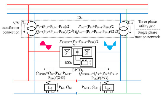 The output powers of two-phase windings in single-phase railway networks have significant differences due to the imbalance of traction loads, causing negative sequence, reactive power, and other power quality problems in the upstream three-phase utility grid. The modified system also has the ability to improve power quality. An EPTD comprises two single-phase back-to-back AC/DC/AC converters and one DC/DC converter with a bus dc link in between. It can control active power exchange and compensate reactive power to present the upstream three phase power as balanced and free of reactive power. By compensating the reactive loads (QEPTDk,1 and QEPTDk,2) and balancing the active load power (PEPTDk) between the two railway power supply sections (take V/V transformer as an example, see Figure 6), the problem of negative sequence and reactive power pollution to the upstream three-phase utility grid can be eliminated. The EPTD can also be used as a three phase balancer for Scott transformer and other transformer connections. At present, many control methods of EPTD (RPC or ES-RPC) have been proposed [35,36,37,38,39,40,41]. This paper did not elaborate too much on it. However, the capacity of the EPTD for three phase balancer can be much larger than that of the EPTD used for the regenerative power user. The capacity reduction methods of EPTD (mainly RPC) have also been investigated [42,43,44].