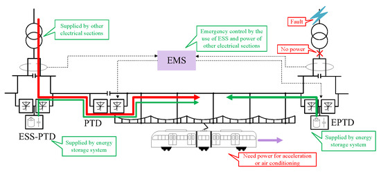 In electrified railways, power failures will have important impacts on the operation and the service quality of railways. During blackout conditions, trains will stop running; there will be no ventilation and mugginess in trains, which greatly reduces the comfort of passengers. The modified system will alleviate this problem. In blackout conditions, the EMS can carry out emergency control by the use of ESS and power of other electrical sections, as shown in Figure 9. The emergency control can maintain a train’s operation during blackout conditions at least until it reaches the nearest station. This will avoid long stops between stations on the canal [20], and keep air-conditioning in operation during the remainder of the train journey to ensure the quality of service provided to passengers.