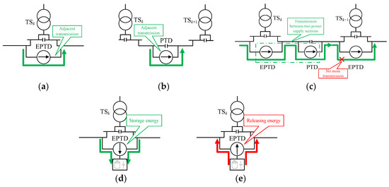 Figure 10. Control algorithm principle: (a) adjacent transmission; (b) adjacent transmission; (c) transmission between two power supply sections; (d) storage energy; and (e) release energy. - (2)