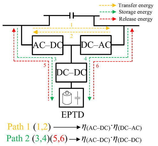 The efficiency of the converter is the most important factor affecting the transmission loss of regenerative braking power. The typical topology of an EPTD is shown in Figure 11, and a PTD was similar, including only AC−DC, and DC−AC. In Figure 11, there were two efficiency paths. Path 1 was transferring the regenerative power by the use of AC−DC, DC−AC converter, and its transmission efficiency was η(AC–DC)·η(DC–AC). Path 2 was storing or releasing regenerative power by the use of AC−DC, DC−DC converter, and its transmission efficiency was η(AC–DC)·η(DC–DC). At present, the efficiency of power electronic converters was very high, above 90%, so the efficiencies of η(AC−DC), η(DC−AC), η(DC−DC) were considered to be similar in this paper.