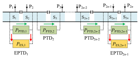 Assuming that transferring regenerative power by EPTD and PTD is PPTD,k; the exchange power in ESS is PES,k. A simplified diagram of power flow in the whole railway system for RBE utilization can be obtained, as shown in Figure 12. The green arrow and the red arrow are the positive direction of transmission power and energy storage power respectively, and the power is negative when they are pointing in the opposite direction. Therefore, transferring power to the right is positive and to left is negative; storing power in an ESS is positive and releasing power from an ESS is negative. Defining the transmission efficiency of each converter is ηk = η(AC–DC)·η(DC–AC); the storage and release efficiency of an ESS from its left port is ηLk = η(AC–DC)·η(DC–DC) (arrow 3 and 5 in Figure 11); and the storage or release efficiency of an ESS from its right port is ηRk = η(DC–AC)·η(DC–DC) (arrow 4 and 6 in Figure 11). Before the modified system operates, each feeder power is equal to the train power in the corresponding power supply sections.