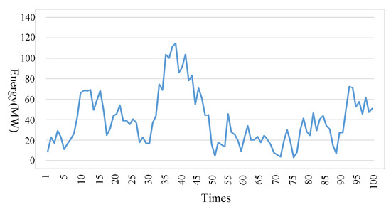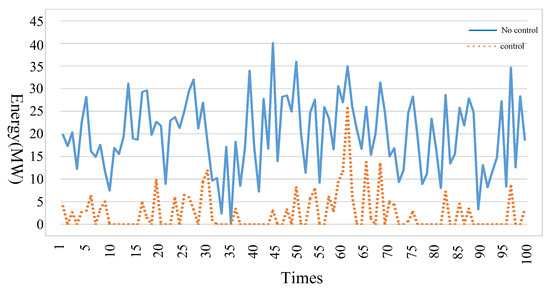 Based on the aforementioned data, 100 groups of train power consumption of no control results in the original system and control results in the modified system were obtained, as shown in Figure 16. With the proposed system and the control algorithm, the regenerative power was effectively utilized within the internal railway system and the power consumption of the whole railway system was significantly reduced. Moreover, when there are surplus regenerative power in the railway system, the surplus power is stored in ESSs and will be utilized for the powering in the other groups later. The storage energy results in all the ESSs are shown in Figure 17. It can be seen from Figure 17 that the ESSs were not only charged but also discharged, realizing full utilization of all the regenerative power within the internal railway system.