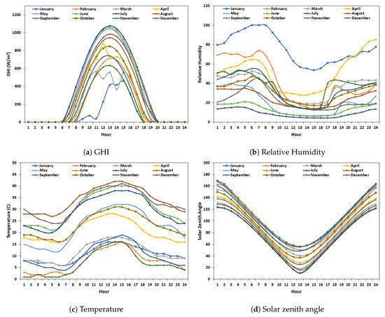 Real-world data sets containing solar irradiance, weather, and cloud cover data are collected. Data sets range from 1 January 2004 to 31 December 2014, yielding 96,360 total observations. Hourly solar irradiance and weather data are obtained from the National Renewable Energy Laboratory’s National Solar Radiation Database for Phoenix International Airport in Phoenix, Arizona. GHI and weather variables, including solar zenith angle, relative humidity, and air temperature, from 2004 to 2014 are chosen for our experiments. These particular variables were chosen based on Pearson correlation coefficients between GHI and each of the variables, which indicates a strong linear relationship between the two variables. The Pearson correlation coefficients are , , and for the solar zenith angle, relative humidity, and air temperature, respectively. Figure 2 shows examples of hourly input data using the first day of each month in 2004. The time at which solar irradiance occurs at sunrise and sunset as well as the amount of solar irradiance around noon varies throughout the year. Additionally, on days where cloud cover is present, the GHI curve features sudden drops in solar irradiance through the day. For the cloud cover data set, the National Oceanic and Atmospheric Administration (NOAA) hosts the International Satellite Cloud Climatology Project (ISCCP) that provides global cloud information at high resolutions. We utilize the ISCCP HXG files which contain data in three-hour intervals at 0.1 equal angles of latitude and longitude. Within these files, cloud cover data is represented in binary with 0 and 1 indicating no cloud and cloud cover, respectively. We calculate a ratio of pixels containing cloud cover to total pixels in order to determine the surrounding cloud activity of a given location. For our experiments, we used an area of three pixels squared with the location of interest in the middle. The solar irradiance, weather, and cloud cover data are then aggregated by repeating the cloud cover ratios three times per interval to match the hourly data set. Before training the networks, the data set containing solar irradiance, weather, and cloud cover data is normalized using Min-Max normalization, reducing the range of data between zero and one.