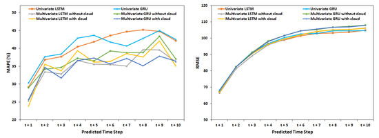 - Performance comparison of prediction accuracy and computation time between GRU and LSTM using various configurations (i.e., univariate, multivariate without cloud cover, and multivariate with cloud cover)