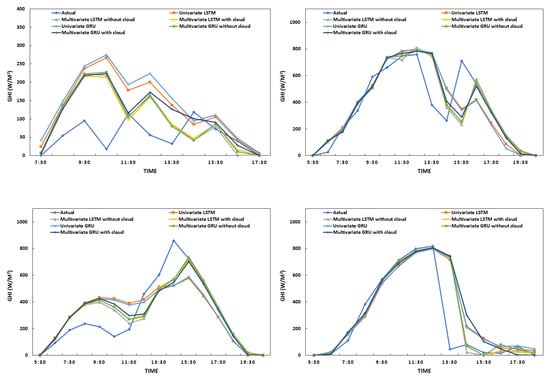 Figure 4 shows the average MAPE and RMSE along with standard error bars for each month of the testing set using multivariate GRU and LSTM with cloud cover. Across all months, the average MAPE and RMSE values were very close between multivariate GRU and LSTM models. In six out of 12 months (i.e., January, April, May, June, October, and November), the MAPE values for multivariate GRU and LSTM were below 20 percent. Similarly, RMSE values below 40 occurred in five out of 12 months (i.e., January, May, June, October, and November). In both MAPE and RMSE, March, July, August, September, and December produced the highest amounts of error throughout the year. Additionally, the standard error bars are wider during these months, indicating high variation in accuracy in that time period. Figure 5 shows the actual solar irradiance and forecasting results for each of the three experiments for GRU and LSTM on four different days throughout the testing year. On these given days, cloud cover was present throughout the day and the amount of solar irradiance during daylight hours was not consistent. In all cases, the multivariate models predicted solar irradiance similarly to one another and closer to the actual values than the univariate models. The highest amounts of error occurred when the model overestimated the solar irradiance or after a sudden change in solar irradiance. On days where solar irradiance is inconsistent in the morning hours, all models overestimated the amount of solar irradiance compared to the actual values; this may be due to the fact that the models learned that solar irradiance increases consistently in the morning hours. After a sudden decrease in solar irradiance, the models react to the sudden change in the following time step, rather than accurately predicting the sudden change. Similarly, the models react to a sudden increase in solar irradiance in the time step directly after. This often led to a high amount of error if the actual solar irradiance increased after the decrease. Because of the reactivity of the models, overall error is higher on days where solar irradiance is inconsistent and stochastic. It would be helpful to seek higher resolution data for solar irradiance, weather variables, and cloud cover time series in order to combat the problems with overestimation and reacting to sudden changes in solar irradiance [25].