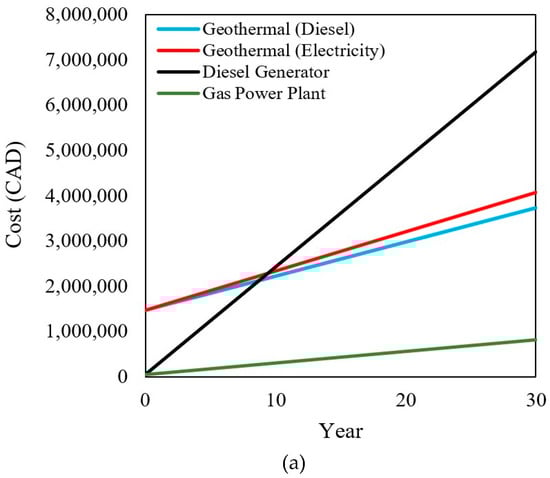 While the greenhouse is in operation, the generator must be supplied with 180 liters of diesel every day per greenhouse and 552 liters of diesel every day for three greenhouses. Although this is a substantial amount of fuel, it would be significantly cheaper in Resolute and ON to run a dedicated and appropriately sized diesel generator instead of using local power generation (Figure 6). After eight days of operation in Resolute, the initial cost of the generator and operational cost of diesel is surpassed by the cost of using local power generation; in ON this occurs after 750 days. For these analyses, a cost of $1.15/L of diesel is used, a value deemed reasonable through experience in each area. For electricity, a lower value of $0.94/kWh in Resolute and a peak-hr cost of $0.32/kWh in ON is used [65,101]. Table 13 shows the operational costs for the considered greenhouses in Resolute and ON.
