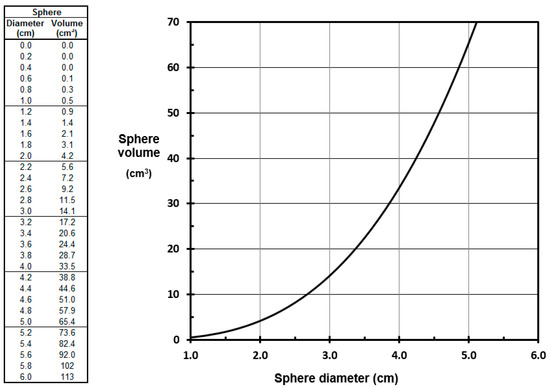 In the present study, OGI cameras were used for identifying leaks. For quick estimates of leak rate, a very simple guide was developed to support the operators in doing soap bubble tests using spray (CRC Leak Finder Spray). The guide, as shown in Figure 2, presents the volume of a sphere as a function of diameter to assist in volume rate estimates of the bubbles generated by leaks. The operators were instructed to count to for example, 10 s (1001, 1002, 1003, …), record the dimension of the individual bubbles or bubble groups, using a ruler, note the total bubble volume, correct for the shape of the bubbles (e.g., half sphere) and divide by the bubble development time. This gives a fair leak rate estimate in cm3/s. Blind tests were also conducted in a lab, where 90% of the estimates were within ±30% of the correct value. In the field it may be expected that volume estimates are slightly less accurate. Leaks that generate bubbles so fast that the operators were unable to quantify these leaks were simply identified as “super-emitters.” Such leaks could then, if needed and considered safe, be quantified by for example, Hi Flow sampling.