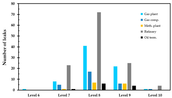 The distribution of quantified leaks from all the facilities combined, is presented in Figure 7. Though the Level 8 leaks dominate in numbers in Figure 7a, the leaks in Level 7 contributed most to the emission of hydrocarbons, as seen in Figure 7b, while the single leak in Level 6 contributed 12% to the accumulated leak rate. For both the gas processing plant and the gas compression facility, the leaking gas was mostly methane.