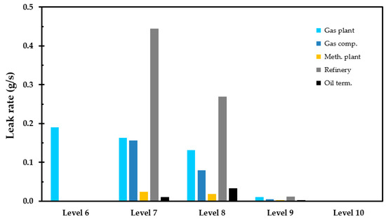 The total accumulated leak rate from these 251 leaks was 0.73 g/s (2.6 kg/h). If unattended for one year, this would result in loss of 49 tons to the atmosphere. It is seen from Figure 5 that leaks in Level 8 dominated the total number of leaks identified at all the facilities. However, when studying the leak rates in each category, as presented in Figure 6, a conspicuous single Level 6 leak at the gas production plant stands out as a major contributor. It is also seen that the leaks in Level 7 contribute much to the accumulated leak rate.