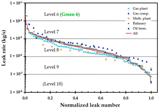 Leak rate for each individual quantified leak for the facilities, arranged per normalized number of leaks at each facility. The suggested leak categorization levels are indicated on the figure. The notion “All” refers to all the 251 quantified leaks, normalized accordingly.