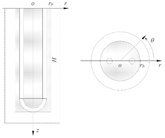where cs is specific heat capacity, J·kg−1·K−1; ρs is soil density, kg·m−3; and κs is soil thermal conductivity, W·m−1·K−1. In BHE applications, the cylindrical coordinate system (r, θ, z) is generally adopted, and the Laplace operator ∇ is then expressed as
